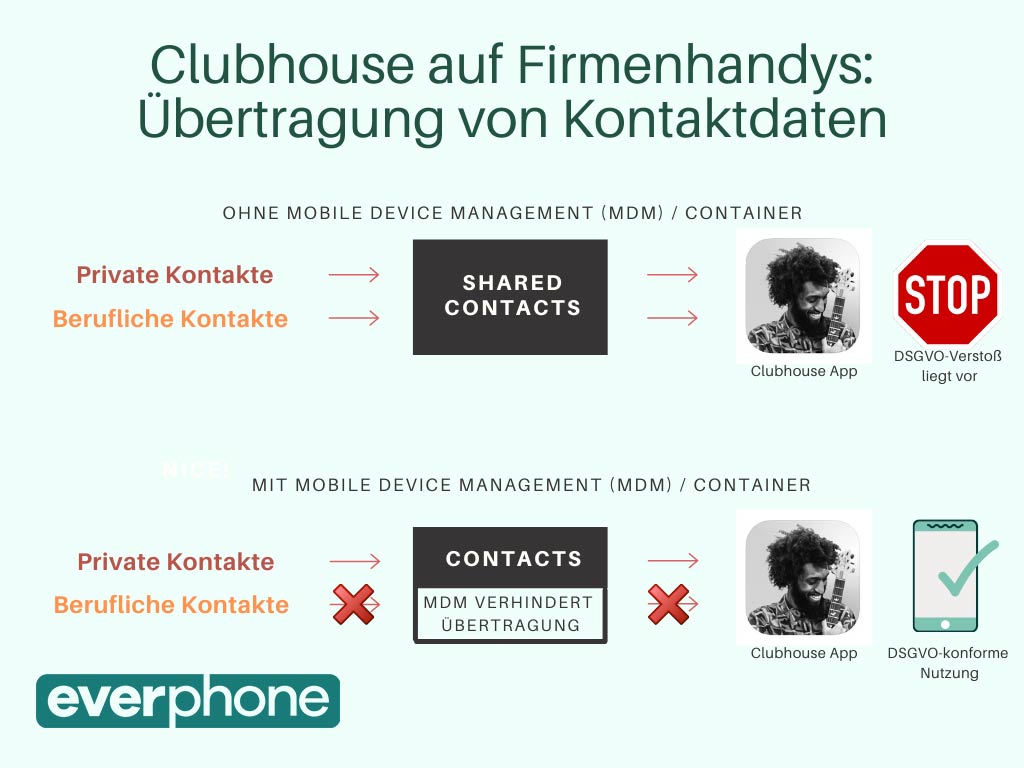 Datenschutz auf Firmenhandys ist nicht zu unterschätzen. Wenn Mitarbeiter*innen Apps wie Whatsapp oder auch Clubhouse ohne Sicherheitsmaßnahmen auf ihren eigenen Geräten oder auf Firmengeräten verwenden, liegt schnell ein DSGVO-Verstoß vor.