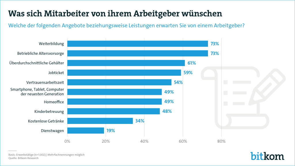 Grundlage für die Angaben ist eine telefonische Umfrage von „Bitkom Research“. Dabei wurden im Auftrag des Digitalverbands Bitkom 1.002 Berufstätige von 16 bis 65 Jahren befragt. Die Fragestellung lautete: „Welche der folgenden Angebote beziehungsweise Leistungen erwarten Sie von einem Arbeitgeber?“ Bei der Beantwortung waren Mehrfachnennungen möglich.