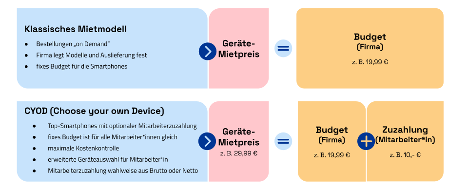 Das nennen wir „Choose-your-own-Device“ (CYOD). Es funktioniert so: Das Unternehmen stellt einen Sockelbetrag zur Verfügung, der für ein günstiges (aber funktionales) Miet-Tablet ausreicht.Möchten die Nutzer*innen ein hochwertigeres Gerät, bezahlen sie die Differenz einfach aus eigener Tasche. Die Zahlung kann vom Brutto- und Nettolohn abgezogen werden – die dazugehörigen Daten stellen wir eurer HR automatisiert zur Verfügung.