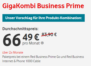 Aktuell beworben wird als „GigaKombi Business Prime“ eine Kombination aus „Red Business Prime Go“ und dem Festnetz-Paket „Red Business Internet & Phone 1000 Cable“. Es sind aber auch individuelle Kombinationen möglich.