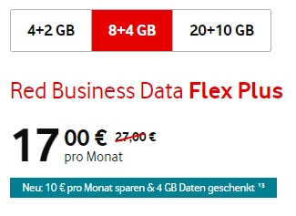 Das Datenvolumen wird in unterschiedlicher Höhe rabattiert beziehungsweise kostenlos erhöht. Aktuell bietet Red Business Data die folgenden Pakete: