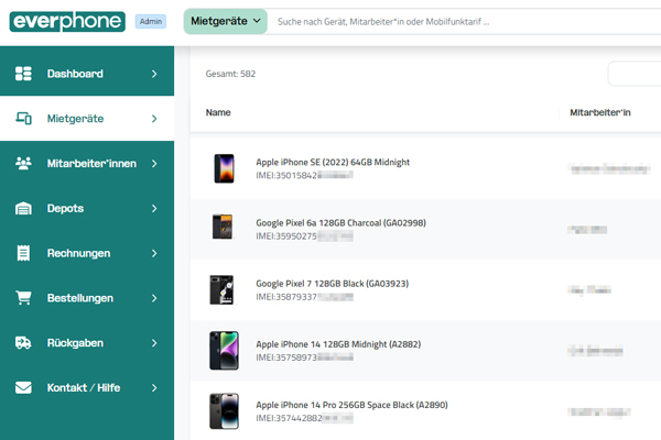 Eine einfache und übersichtliche Lösung für das Asset-Management ist das Everphone-Portal. Unser Portal listet (in der Admin-Ansicht) Mietgeräte, User*innen, Telefontarife, Vertragslaufzeiten und mehr auf. In der User-Ansicht können (falls gewünscht) eure Angestellten direkt Schäden melden oder Geräte-Upgrades vornehmen.
