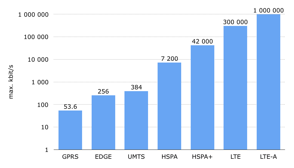 Maximaler Datendurchsatz in kbit/s verschiedener digitaler Mobilfunkstandards bis LTE-A (Quelle: Wikipedia)