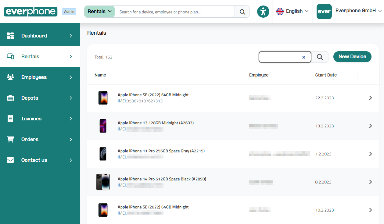 An easy and clear solution for asset management is the Everphone portal. Our portal lists rental devices, users, phone tariffs, contract durations, and more (in the admin view). In the user view, your employees can directly report damages or perform device upgrades (if desired).